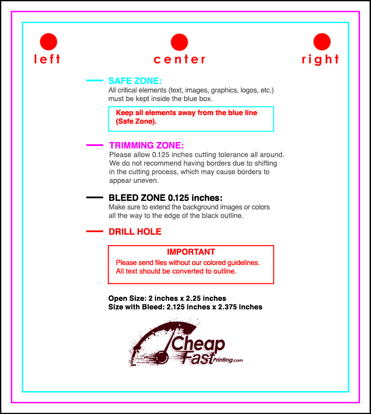 | Bleed Requirement | 0.125" (1/8 inch) total bleed. (e.g., 2x3.5 file size must be 2.25x3.75) |